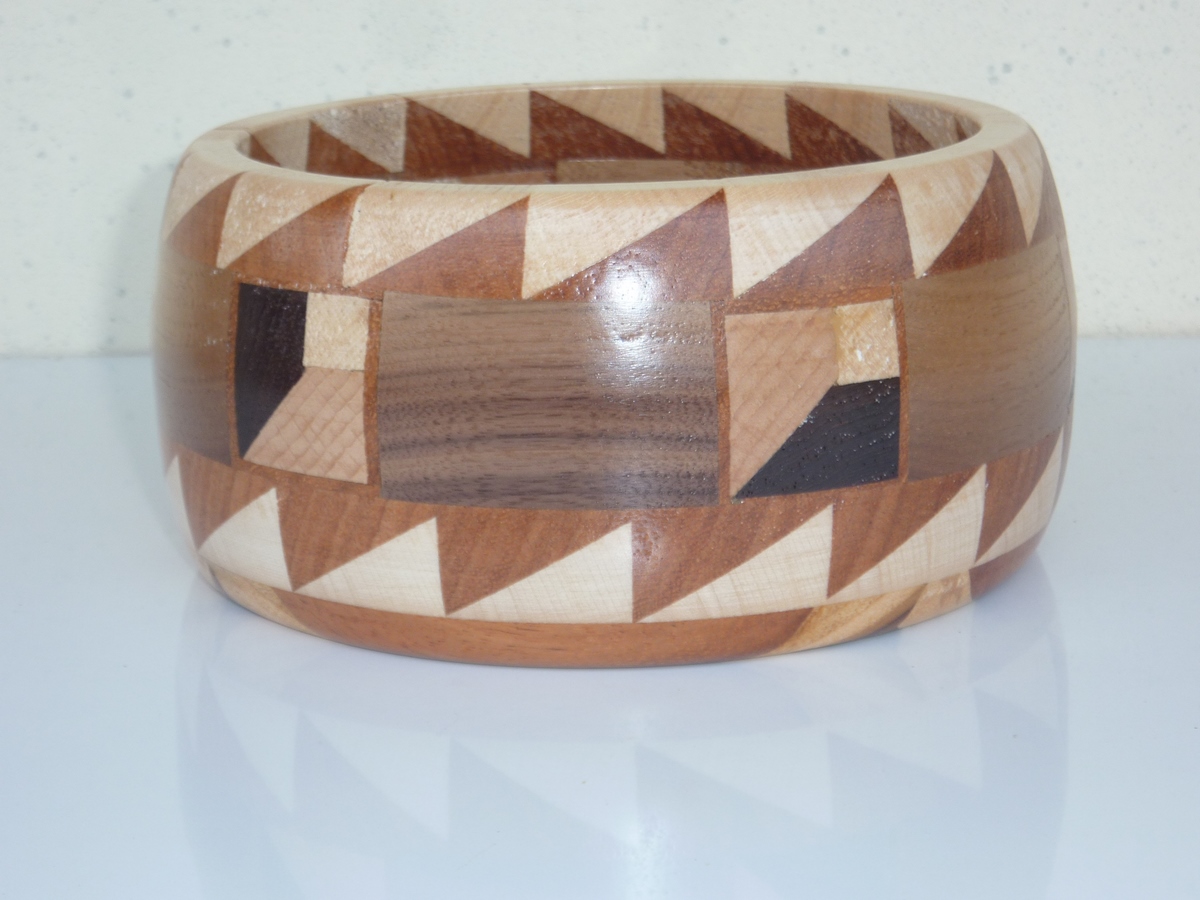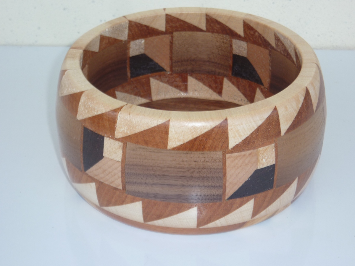Ciotola media segmentata con fondo in stella in Acero e Sapelli e corpo in segmenti vari.Senza coperchio.Finitura in poliuretanico.