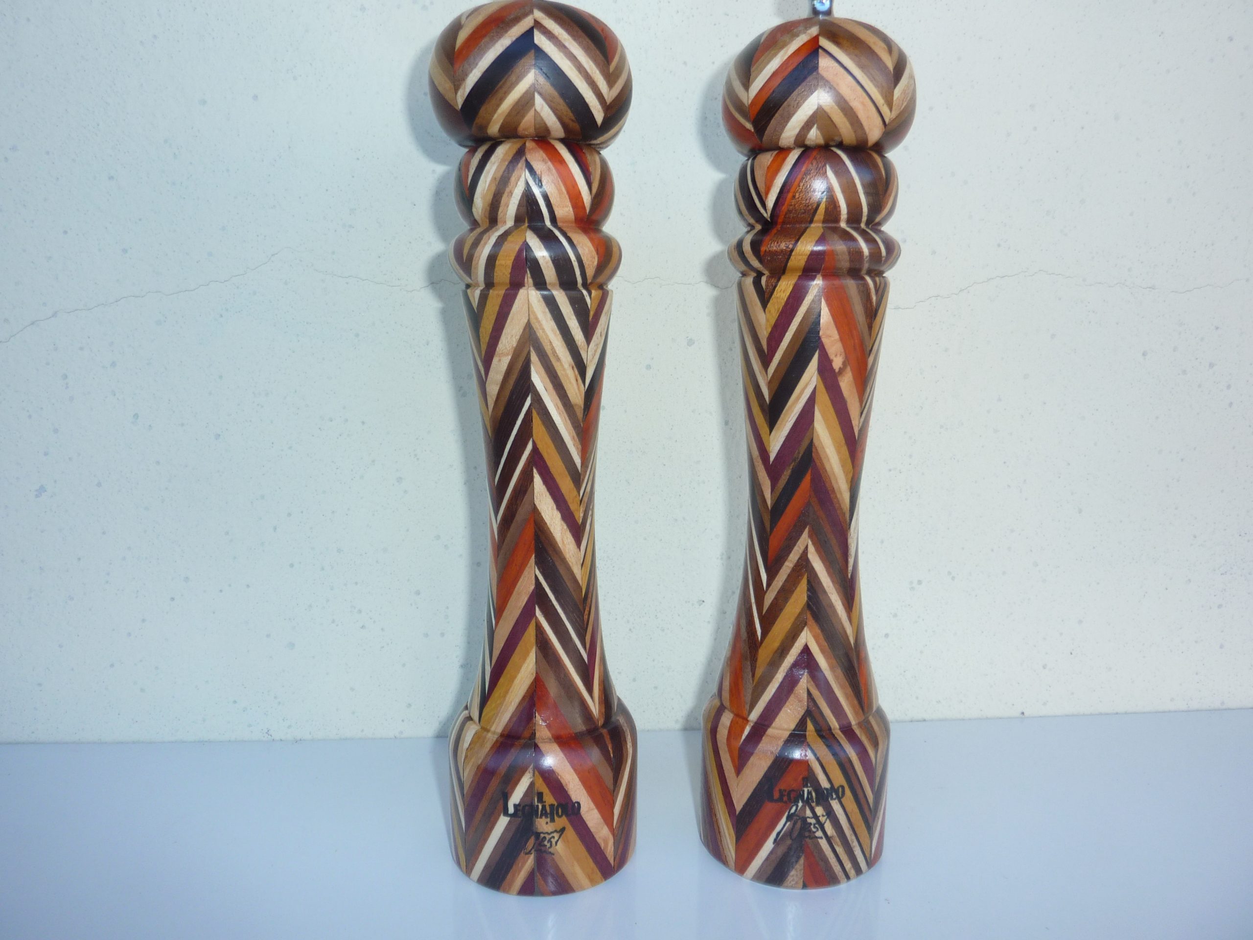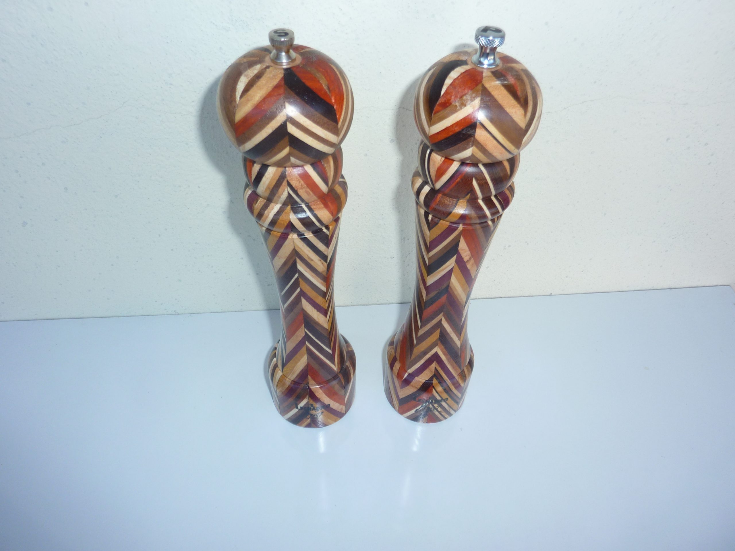 Macinapepe e sale formati da listelli di legni vari esotici incollati diagonalmente e poi finiti al tornio. Finitura in poliuretanico