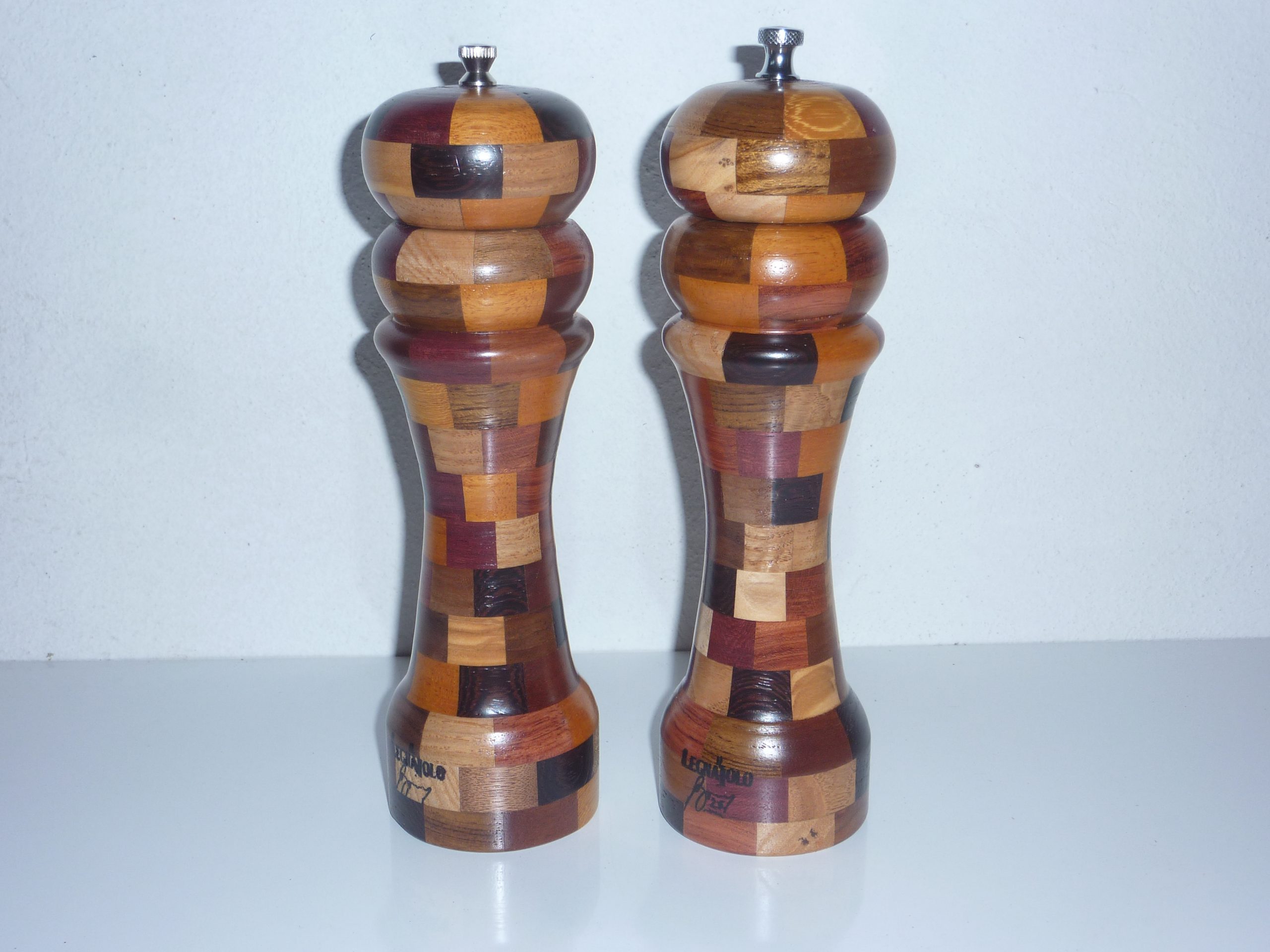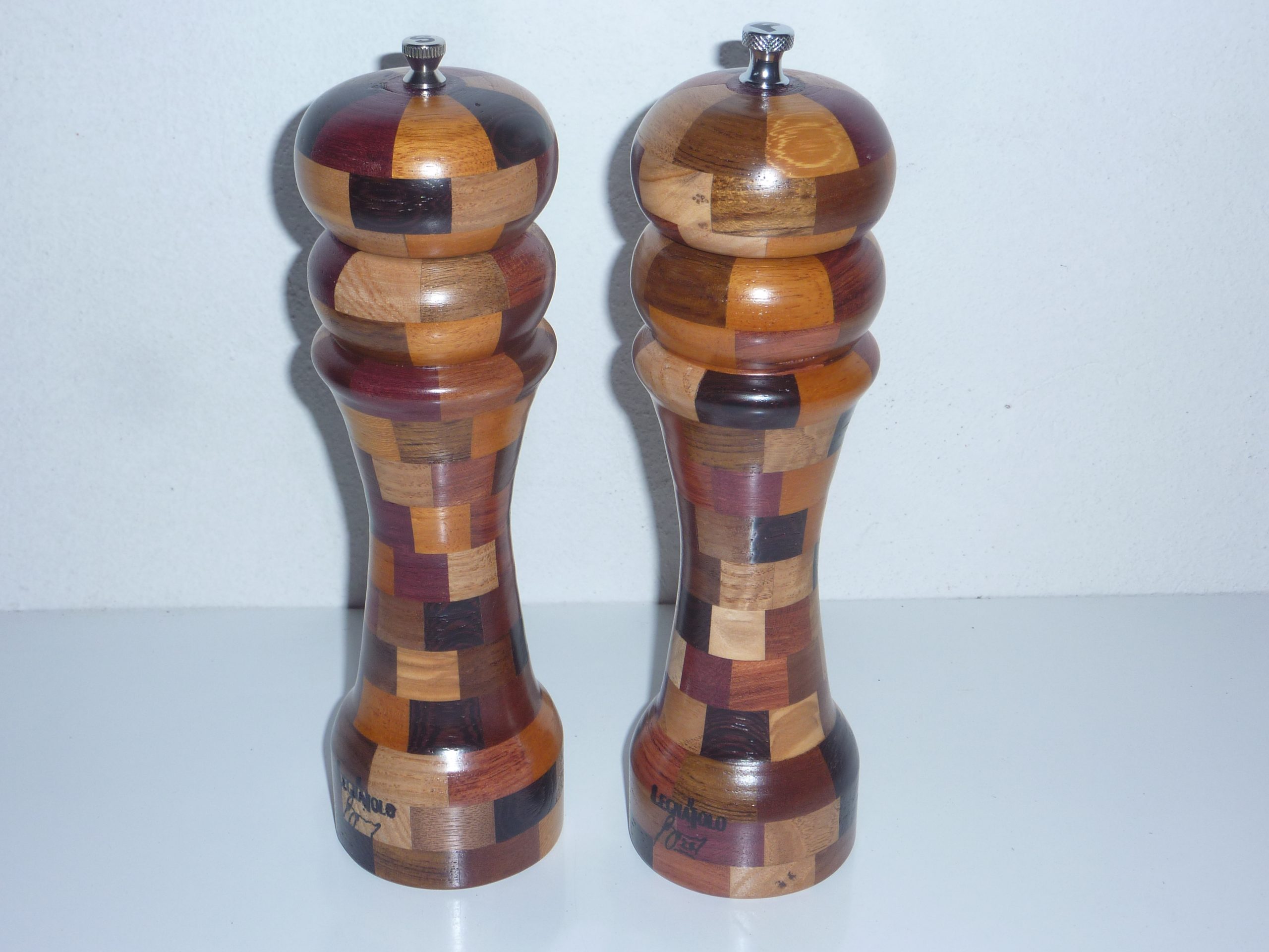 Macinapepe e macinasale composti da tanti pezzettini di legni esotici vari, assiemati e finiti al tornio. Finitura poliuretanica