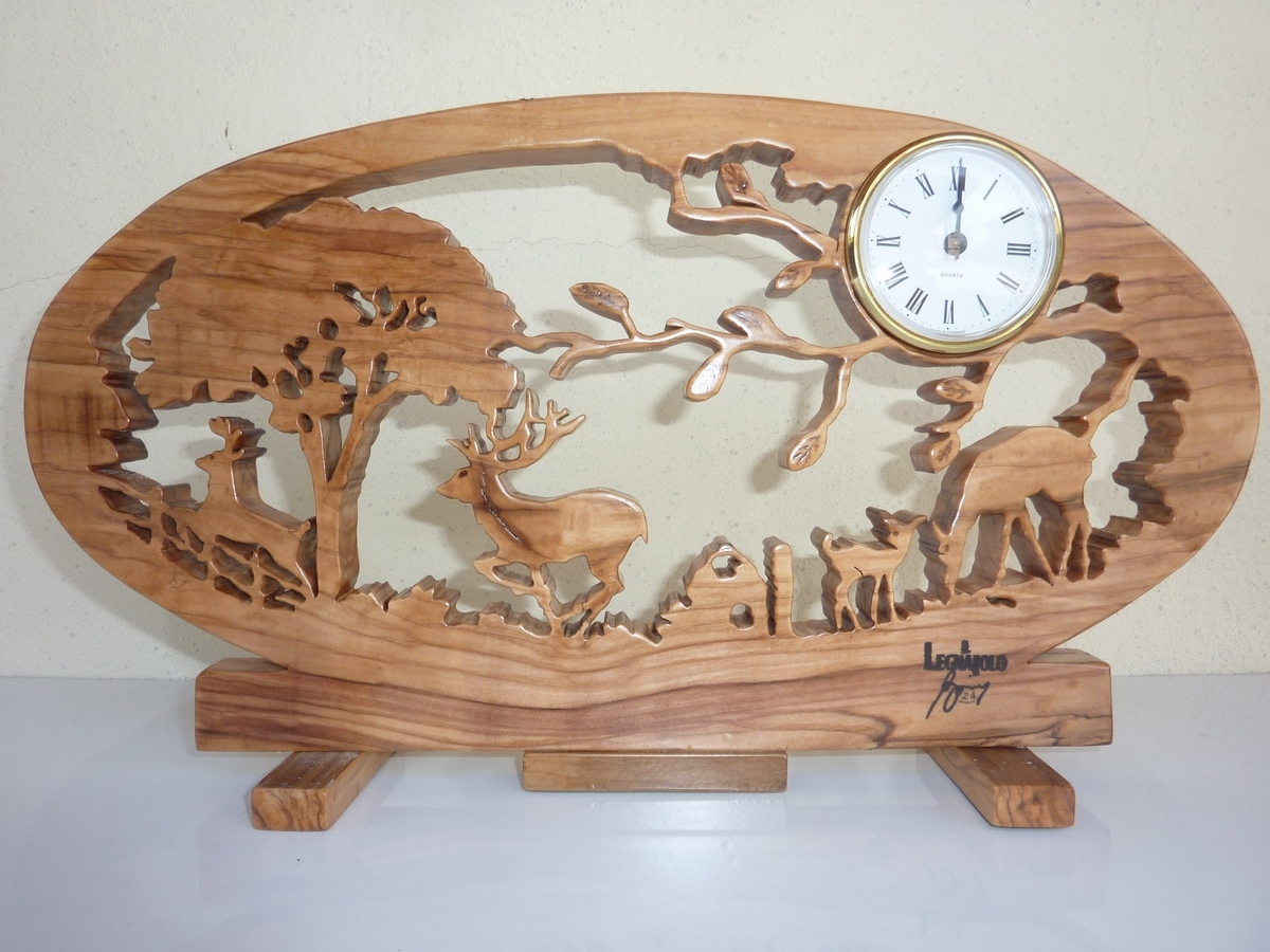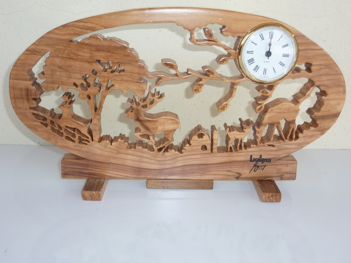 Orologio da tavolo tratto al traforo in ulivo massiccio. Orologio elettronico tedesco. Finitura in poliuretanico