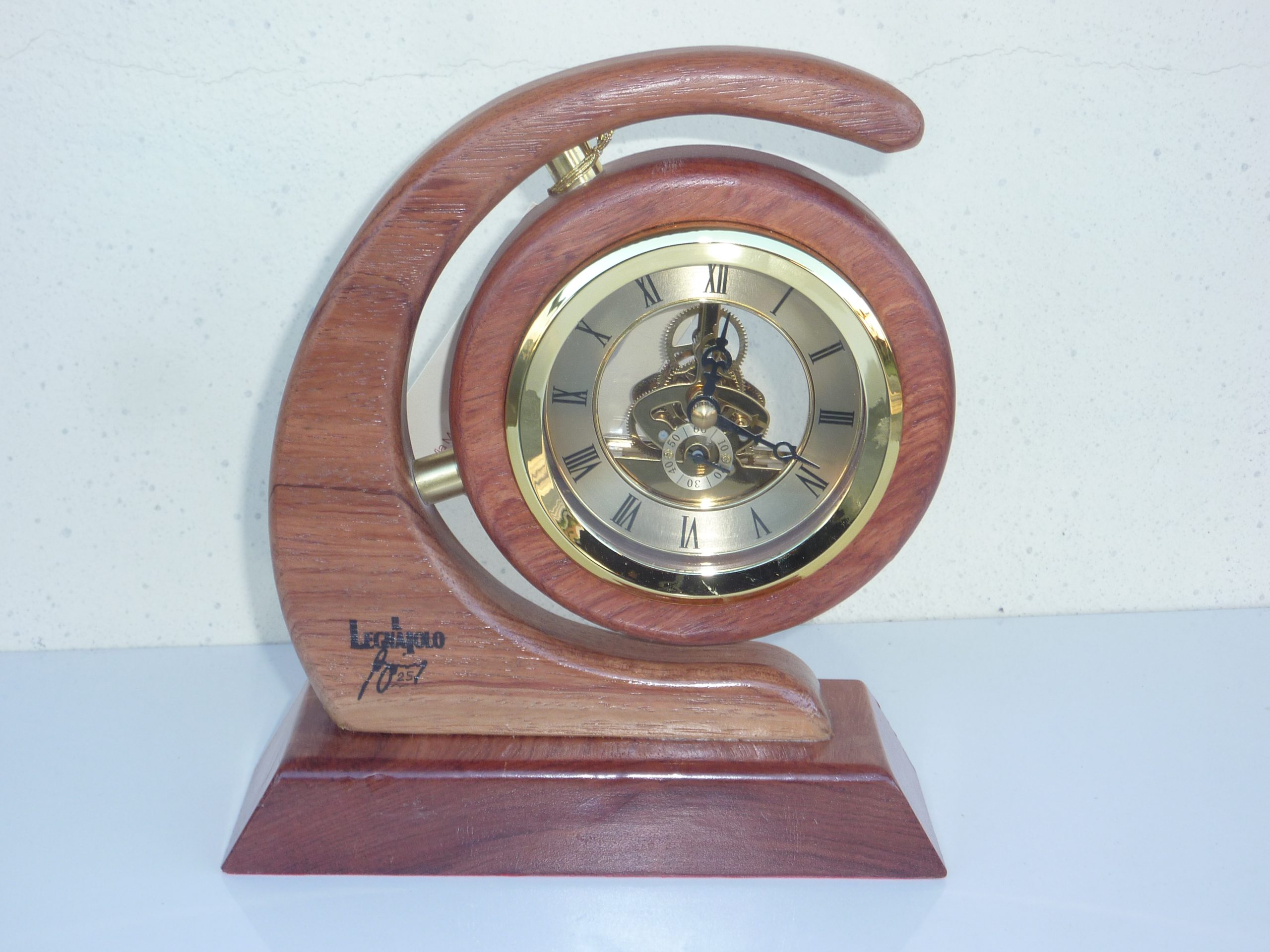 Orologio da tavolo trasparente incastonato in cornice di legno. Finitura poliuretanica