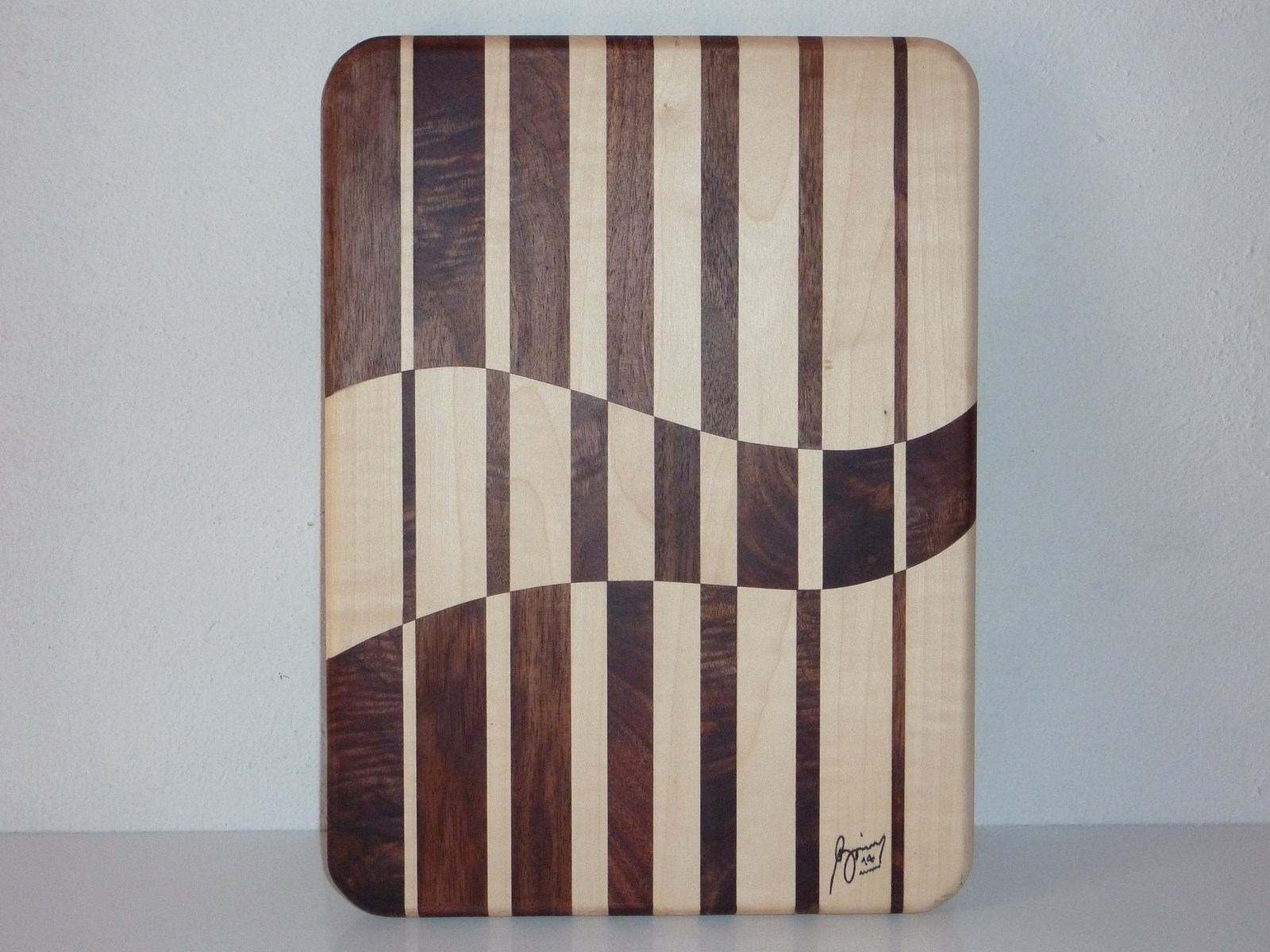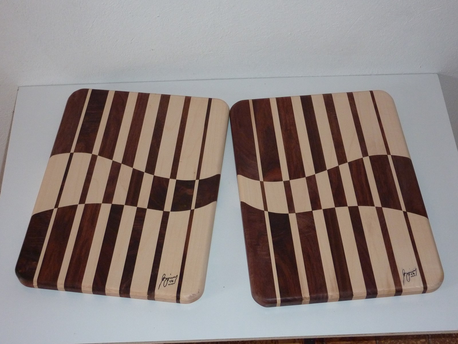 Taglieri con motivo centrale ondeggiante an intarsi di colore contrapposto a scalare. Finitura olio di Tung.