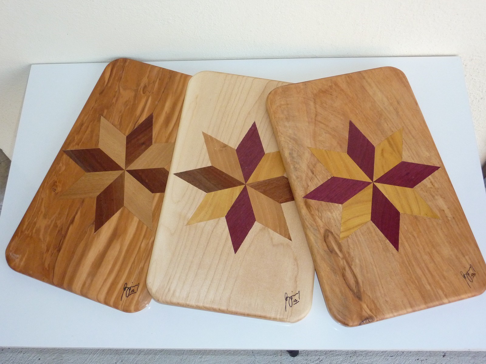 Taglieri con segmenti assemblati a stellai ed inseriti in una tavola intera. Finitura in olio di Tung.