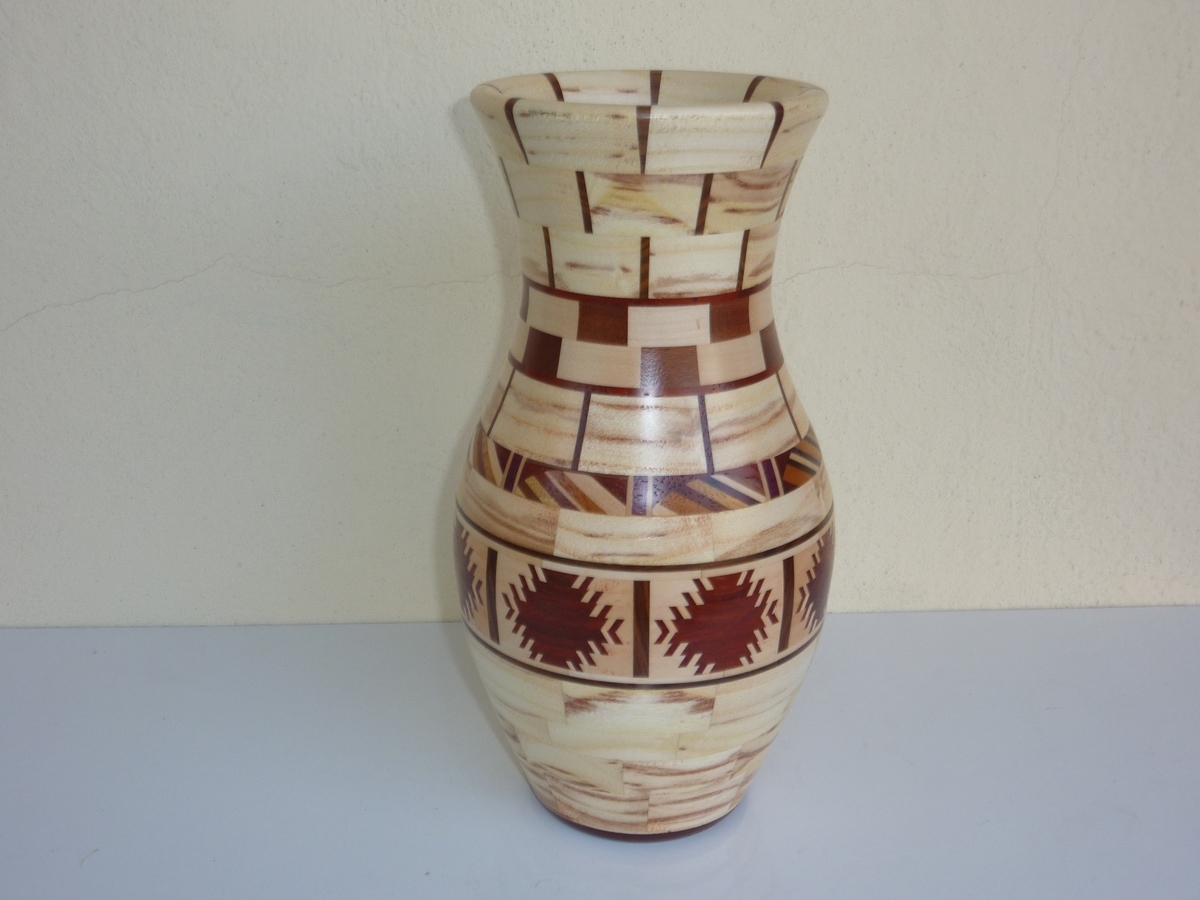 Vaso per fiori con interno in vetro, composto da circa 700 pezzetti di legni vari esotici e nazionali .Finitura in poliuretanico