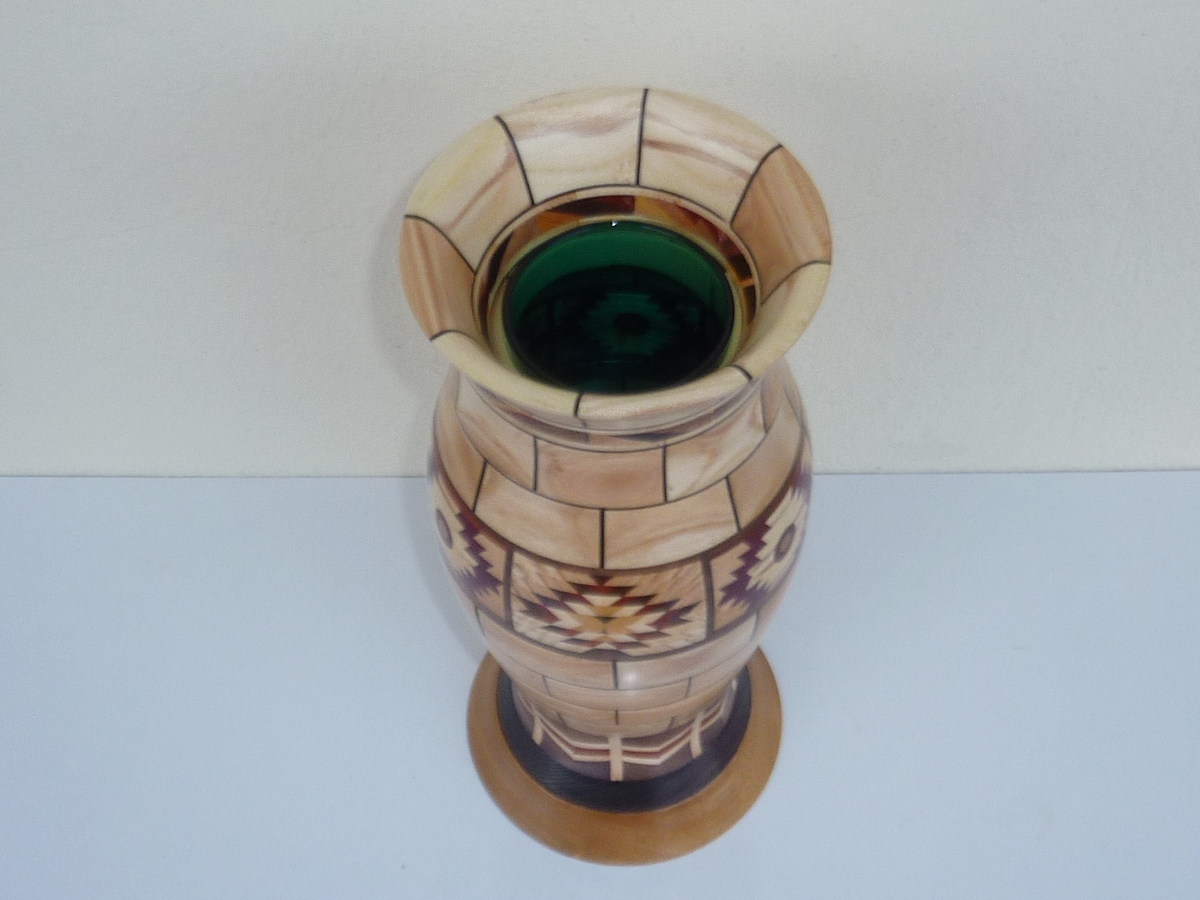 Vaso per fiori in legno segmentato con inserito cilindro in vetro. Finitura in poliuretanico.