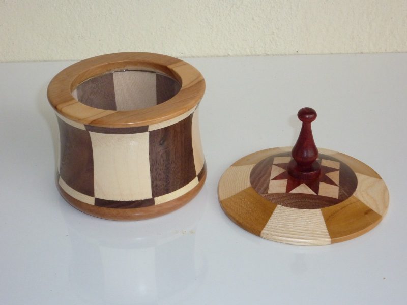 Corpo in acero e Walnut base in Pero, bordino in Ulivo,coperchio in Gelso, Frassino, Walnut, Padouk. stella in Amaranto